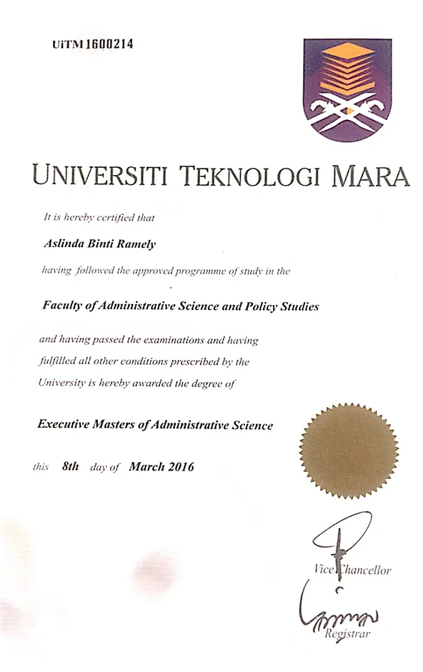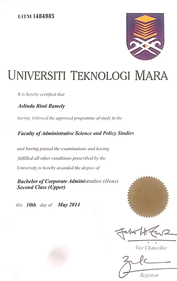 - Bachelor of Corporate Administration (Hons) (UiTM1404985)